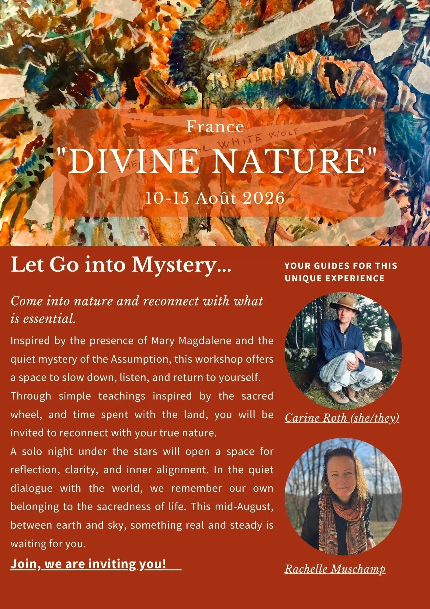 Dans l’énergie de Marie Madeleine et de l’assomption, en anglais et français, avec une nuit solo sous les étoiles, la force d’initiation du ciel et de la terre nous attendent pour la mi-Août.
